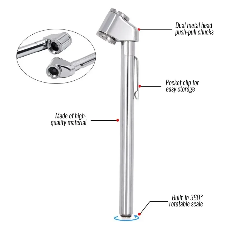 --الجسم صغير ويمكن تثبيته على جيب الملابس، وهو مريح جدًا للحمل.يمكنه قياس ضغط إطارات إطارات السيارة بالضغط على فوهة الهواء.من البسيط والعملي معرفة سلامة الإطارات في أي وقت.