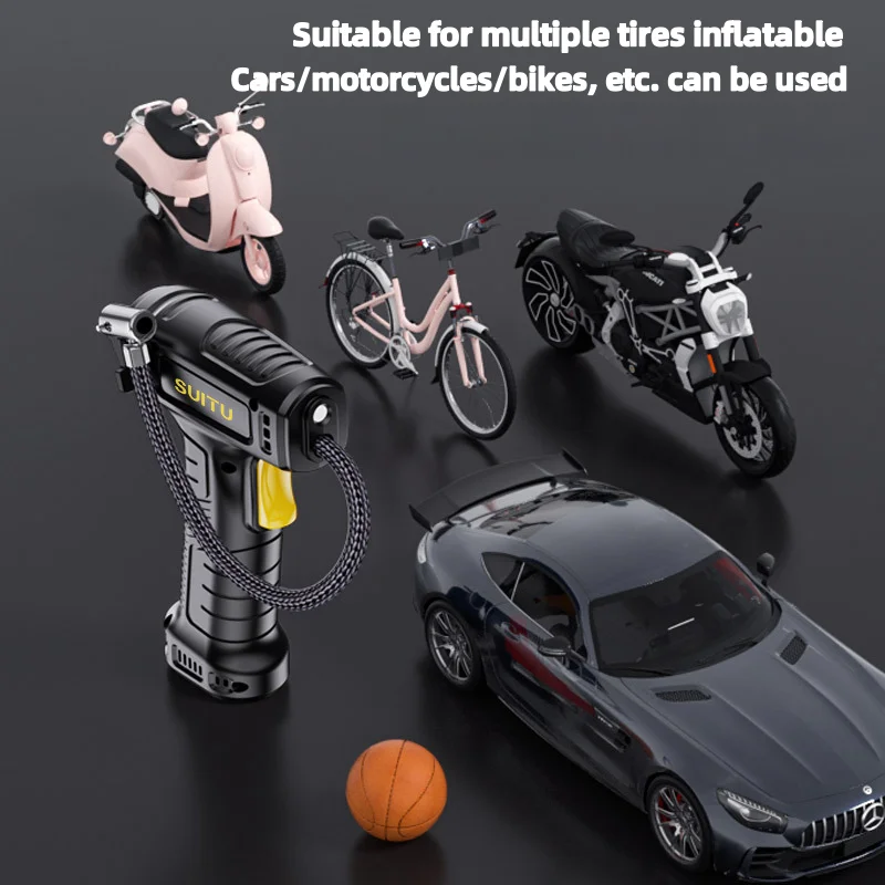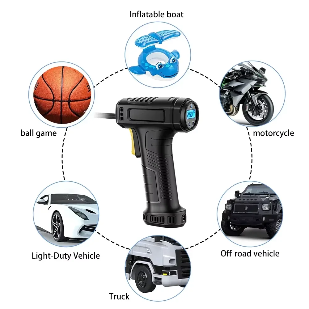• تصميم متعدد الوظائف متعدد الاستخدامات - مثالي لنفخ إطارات السيارات وإطارات الدراجات النارية وإطارات الدراجات والمعدات الرياضية والمراتب الهوائية وعوامات حمام السباحة وغيرها من المواد القابلة للنفخ - مما يجعله أداة أساسية متعددة الأغراض للمنزل والسفر والاستخدام في حالات الطوارئ.