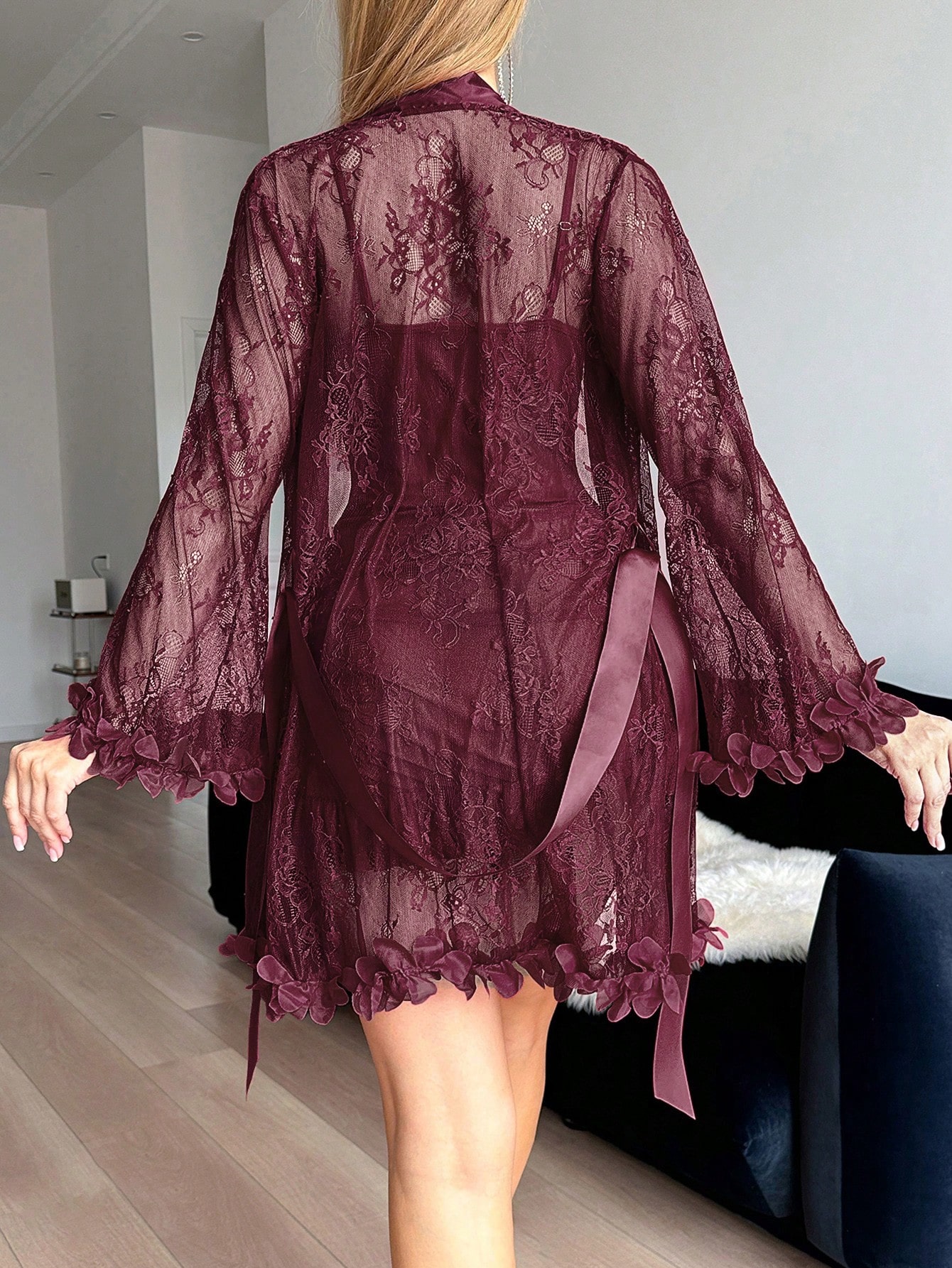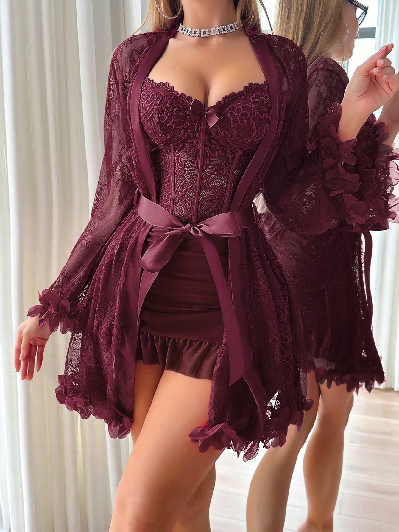 SHEIN طقم مكون من قطعتين: رداء زهري ثلاثي الأبعاد تصميم خصر عظم السمكة فستان نوم كاميسول