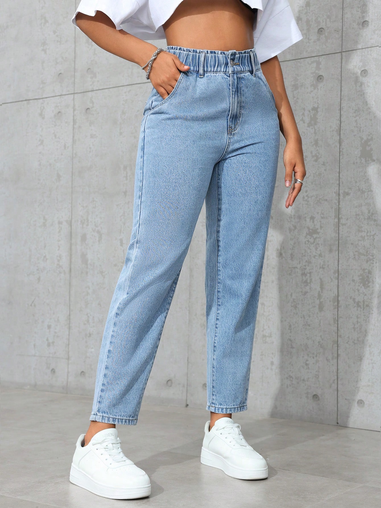 SHEIN PETITE 5 جيوب سروال كاجوال مصنوع من الجينز بأزرار أمامية، للارتداء اليومي